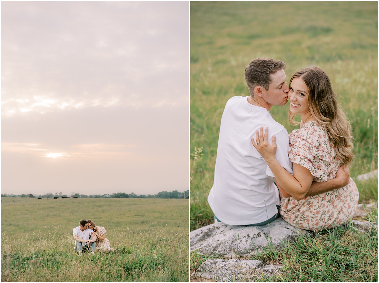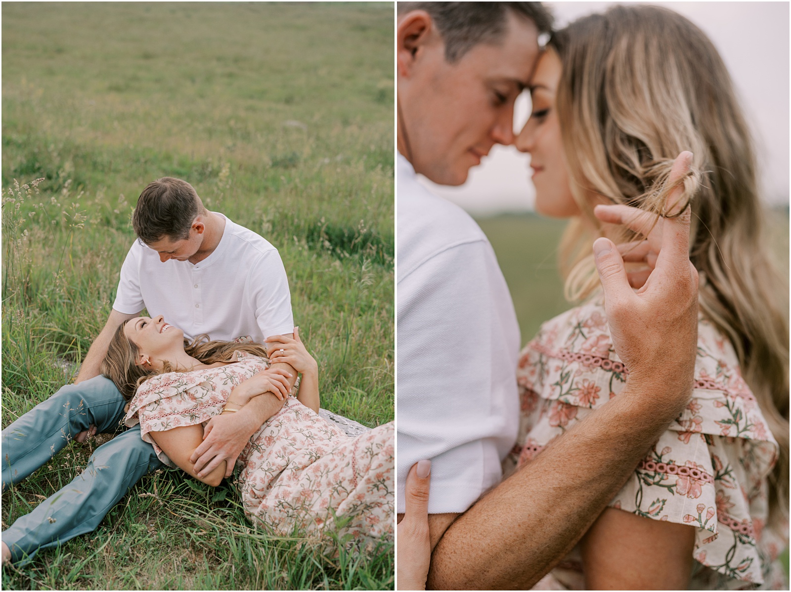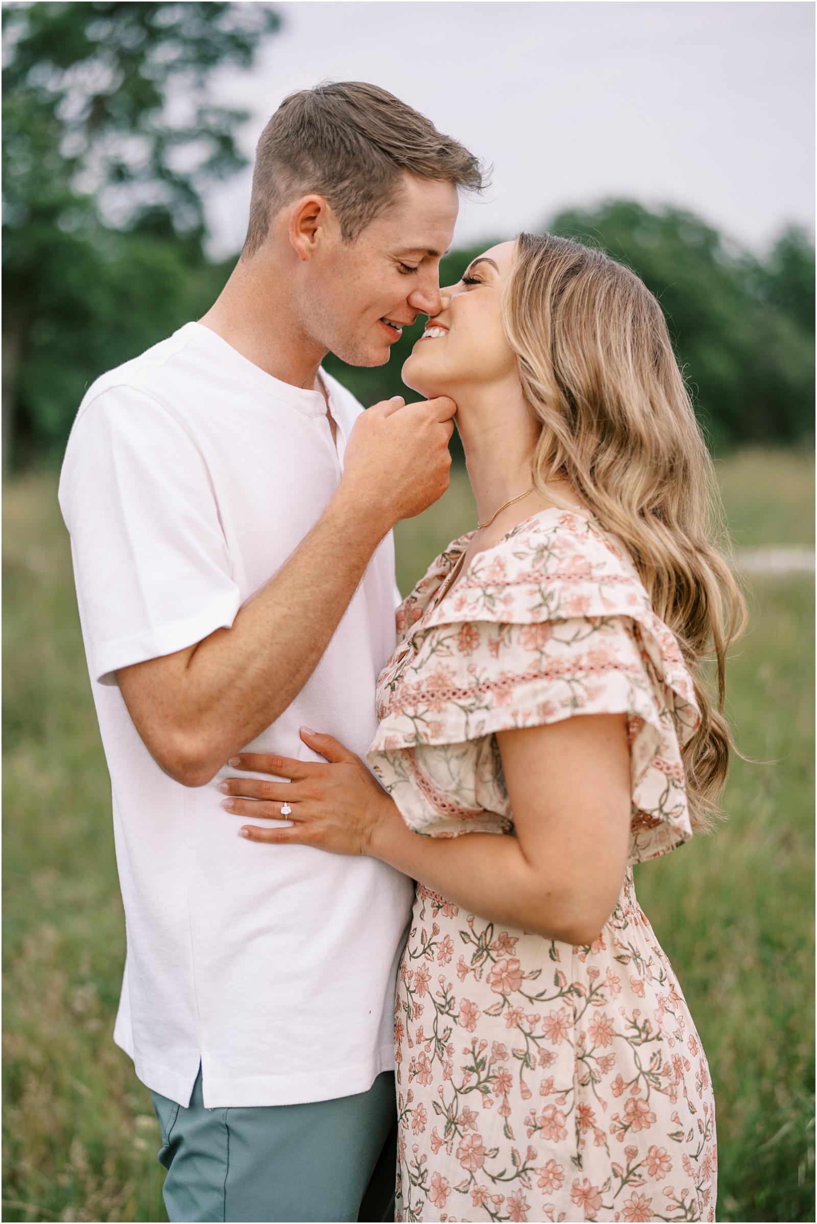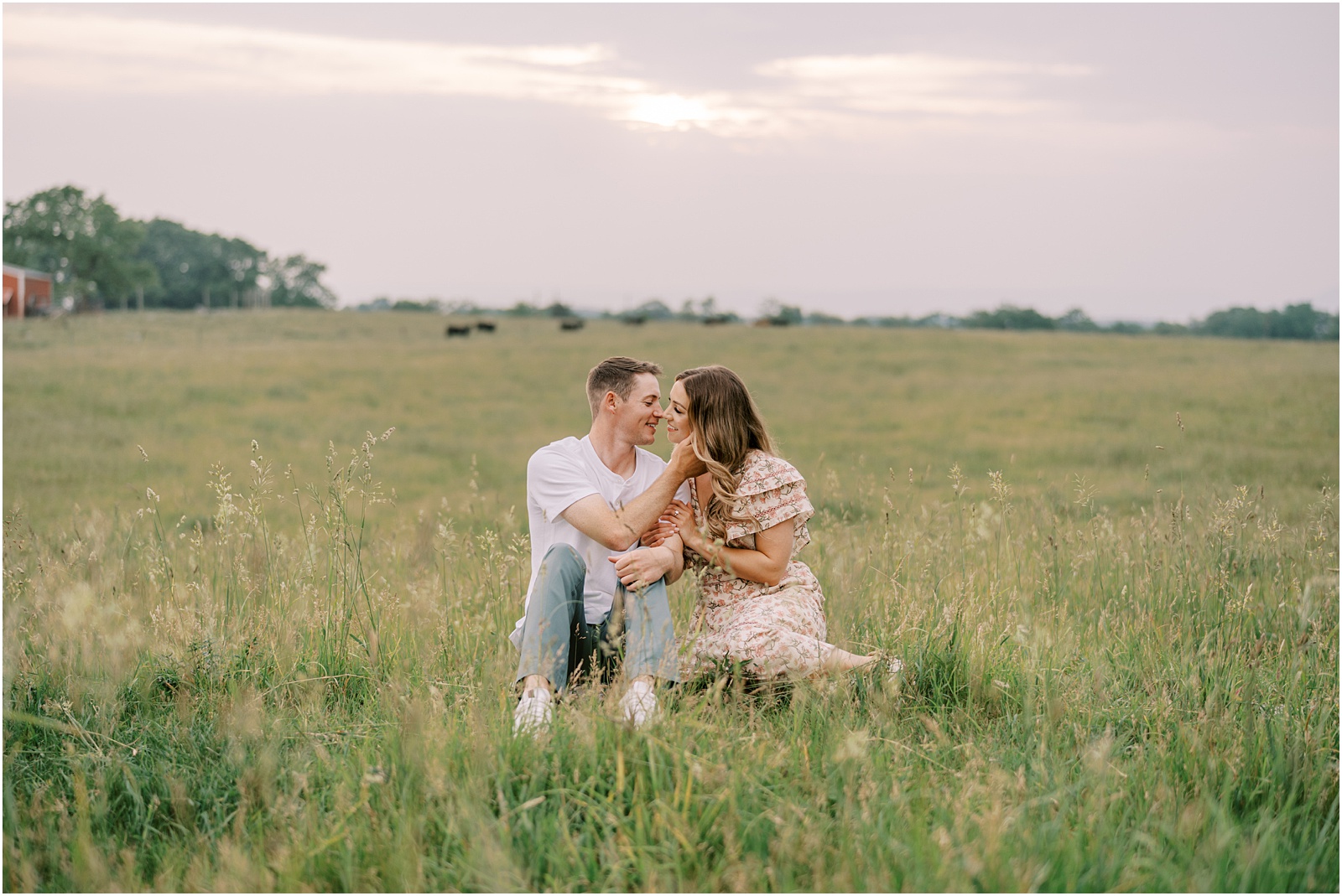 We photographed their engagement in her parents backyard. It was the perfect Greencastle field surrounded by warm light and tall grass. Oh, and cows! Of course! No elaborate props or fancy setups; just the two of them, wrapped in laughter and warmth, the same kind that started over burnt steaks and a golf lesson. 😉