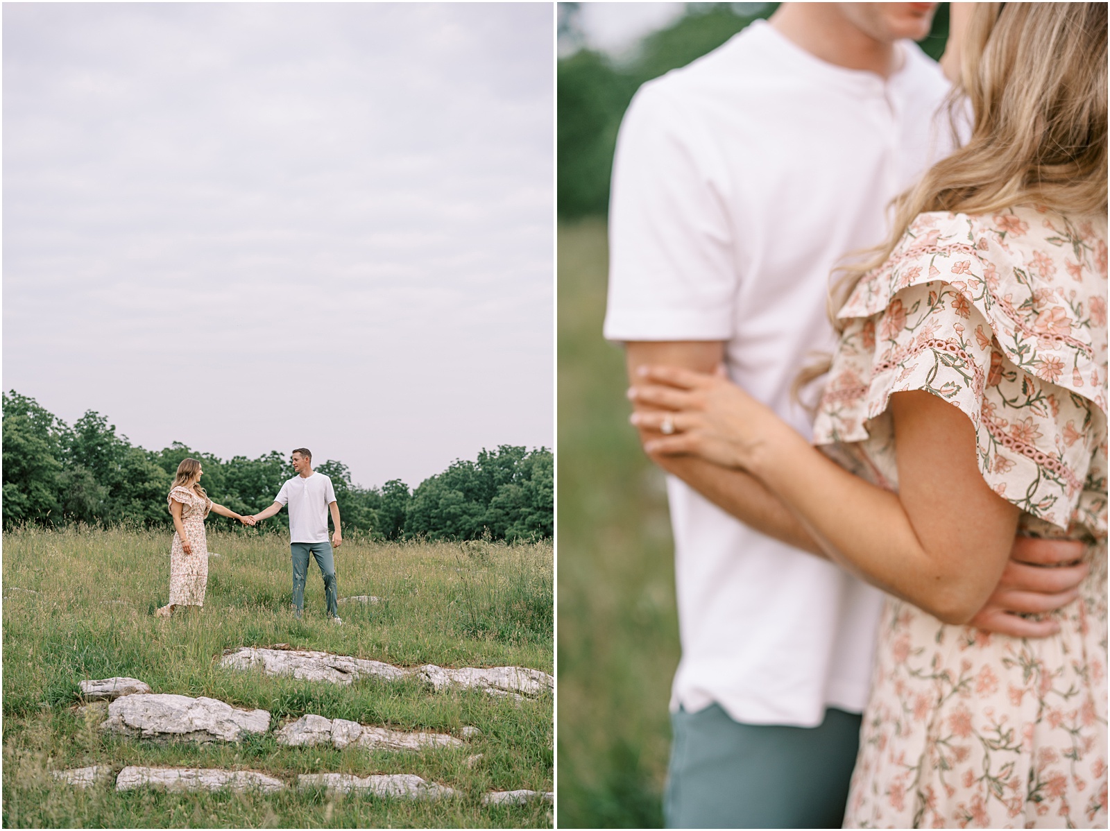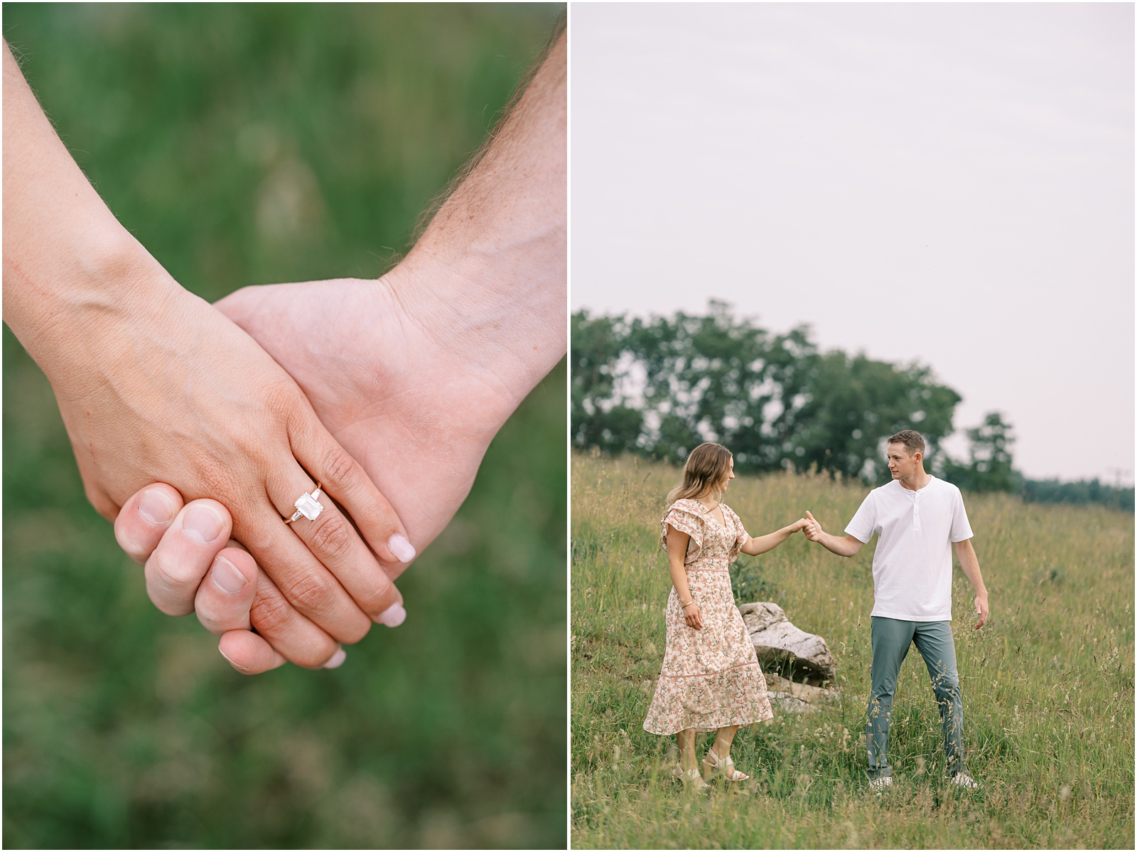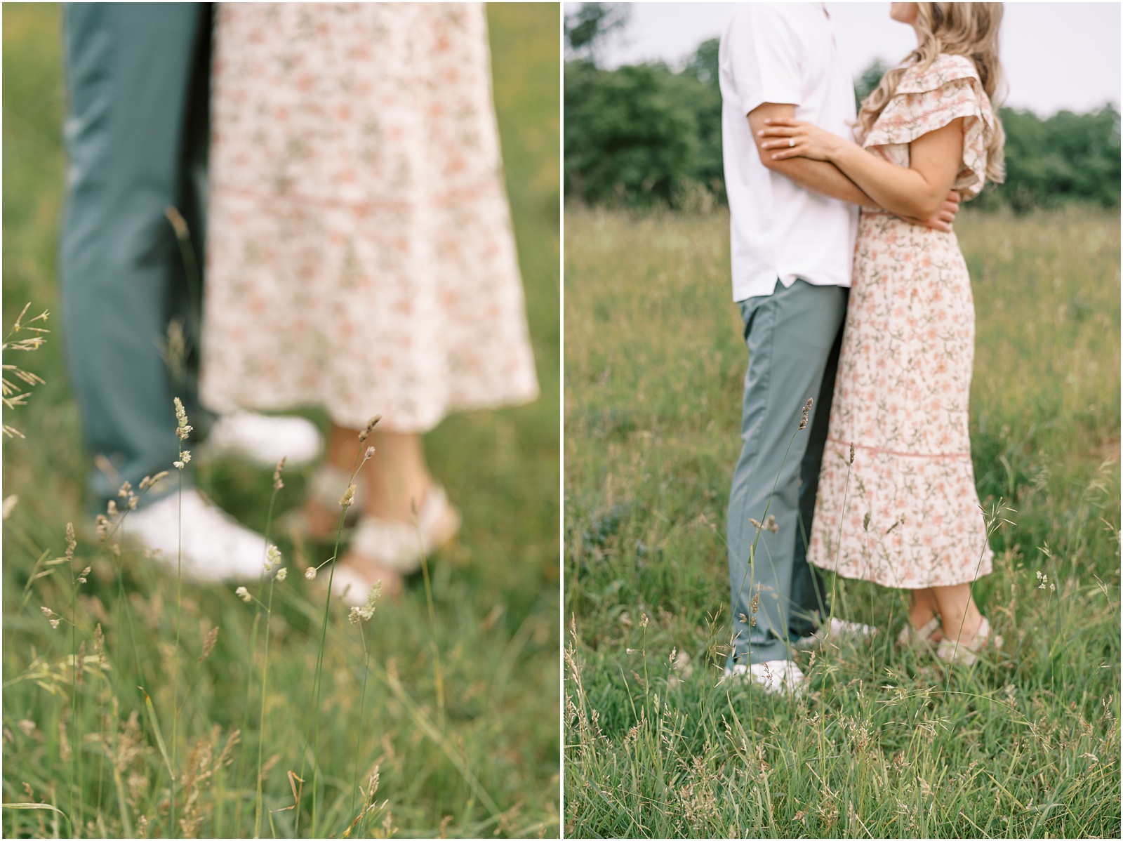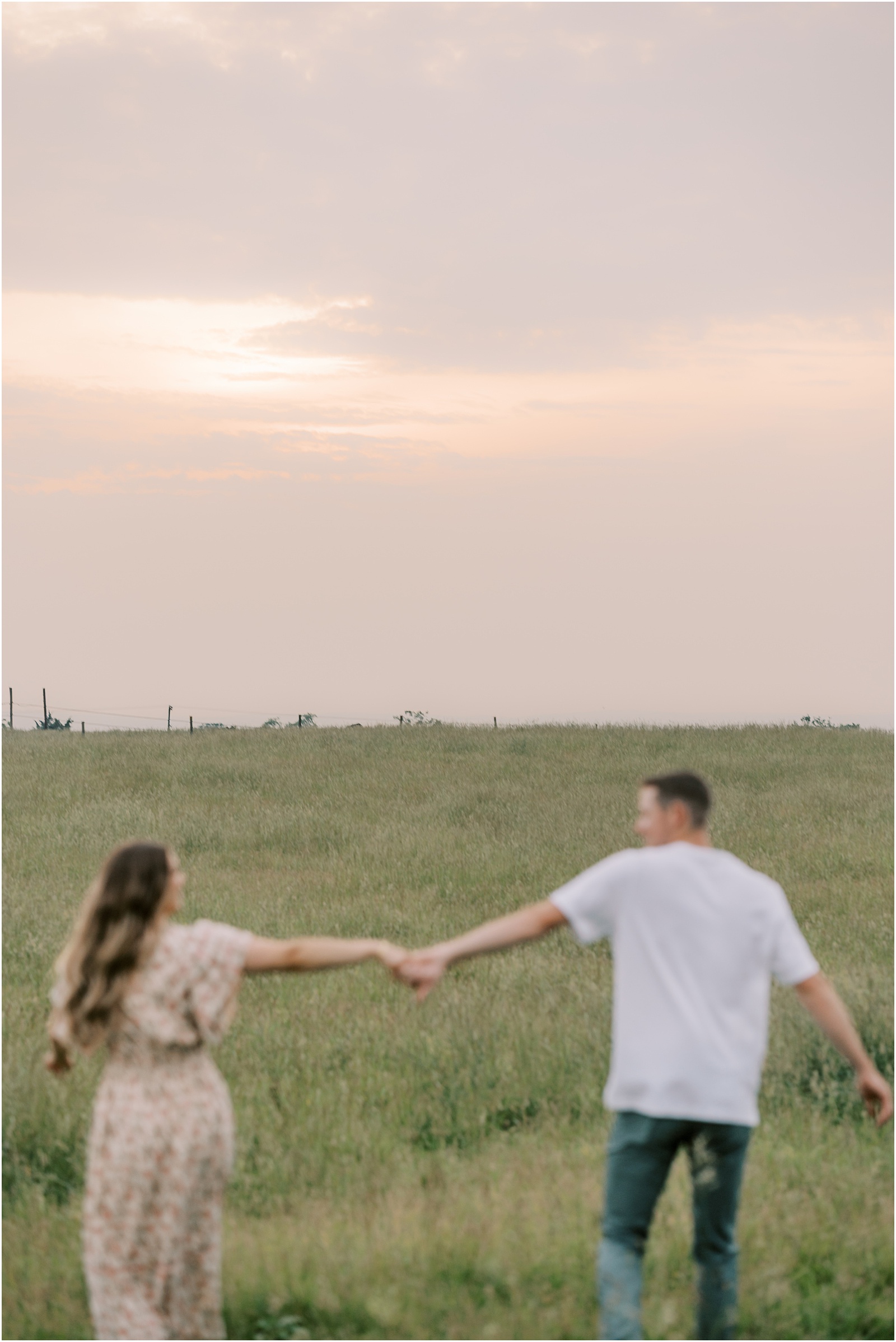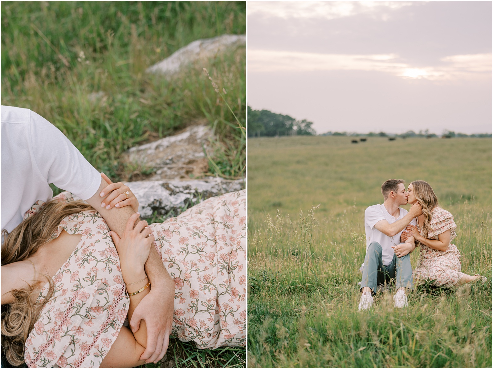 We photographed their engagement in her parents backyard. It was the perfect Greencastle field surrounded by warm light and tall grass. Oh, and cows! Of course! No elaborate props or fancy setups; just the two of them, wrapped in laughter and warmth, the same kind that started over burnt steaks and a golf lesson. 😉