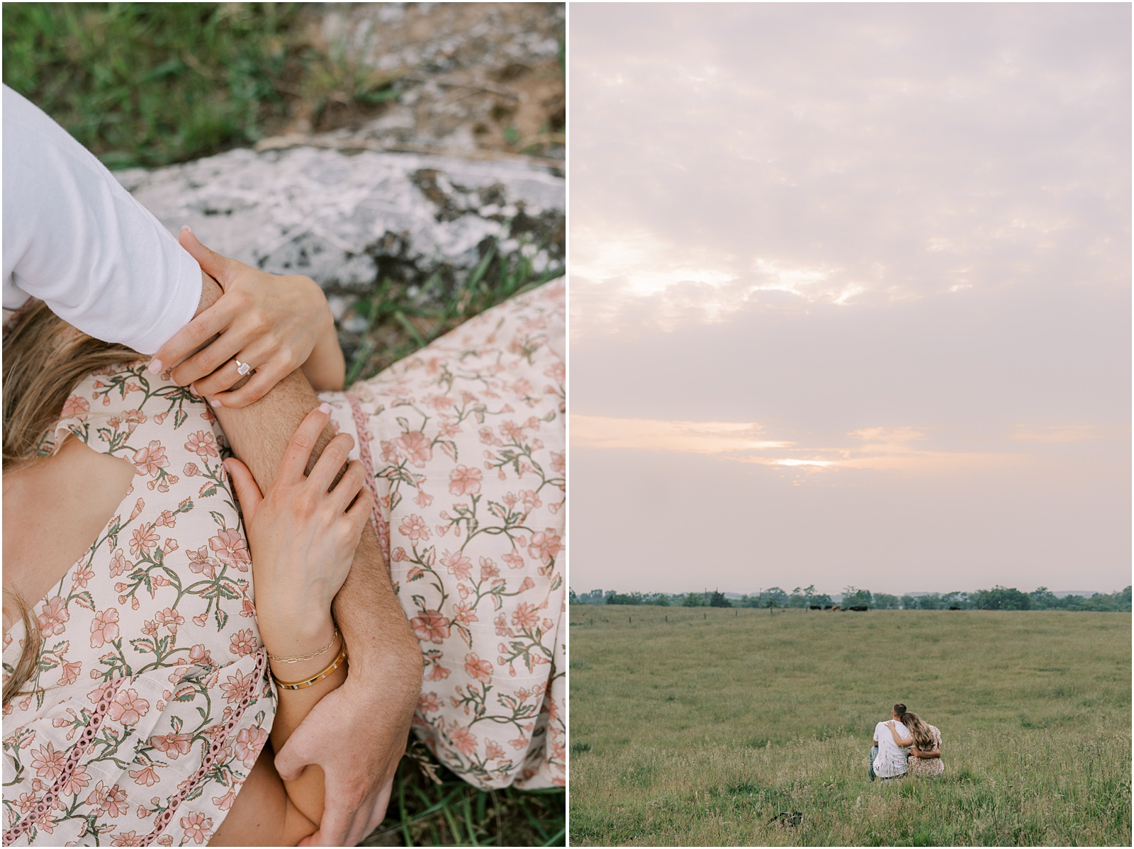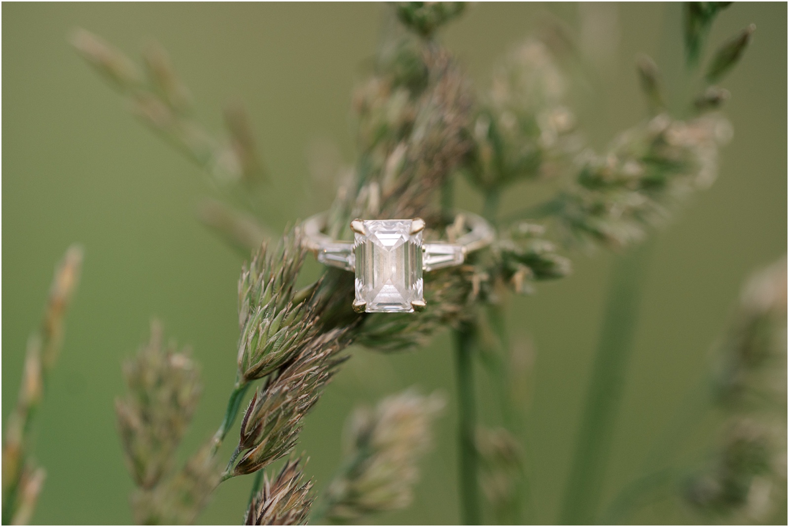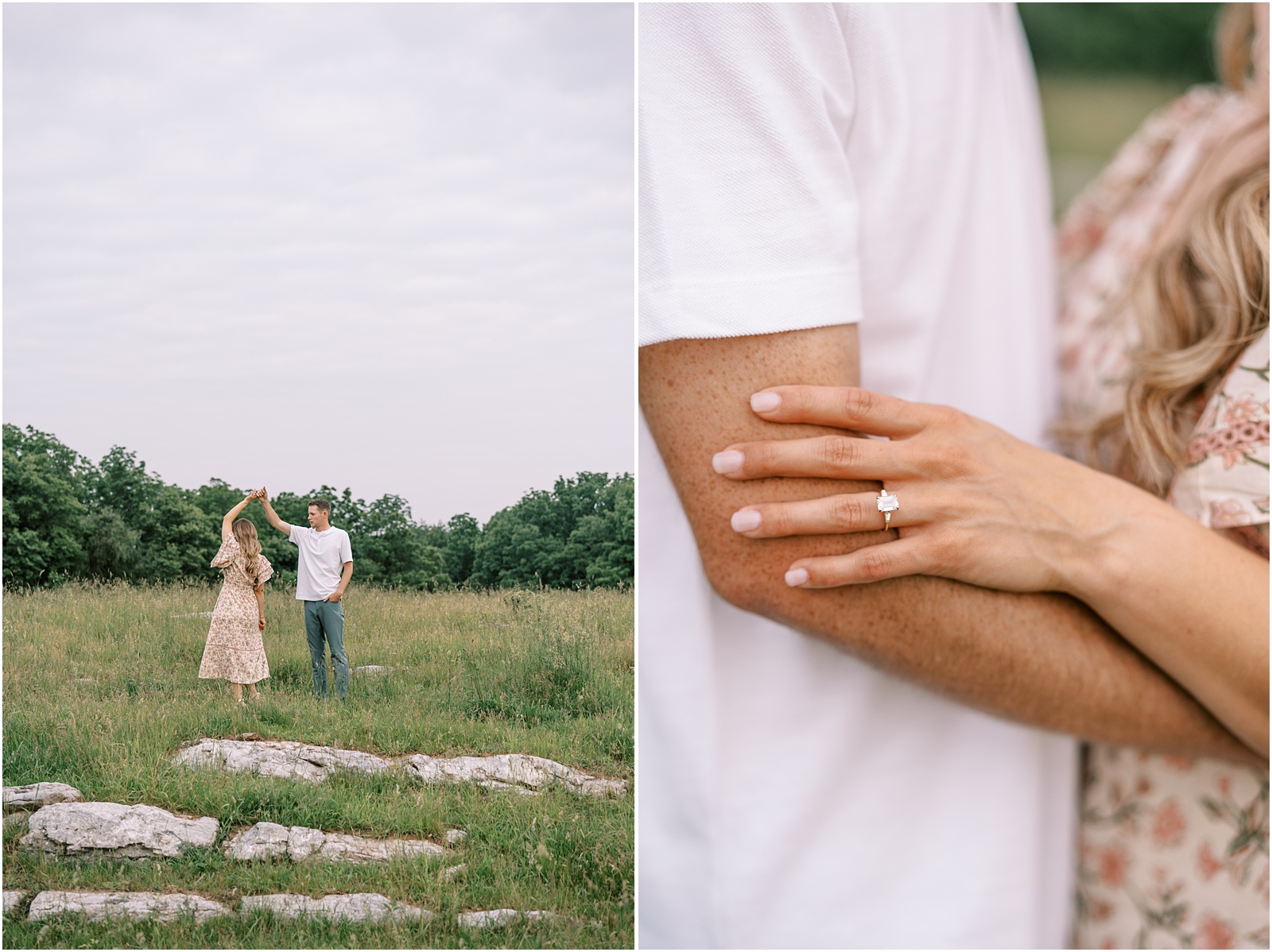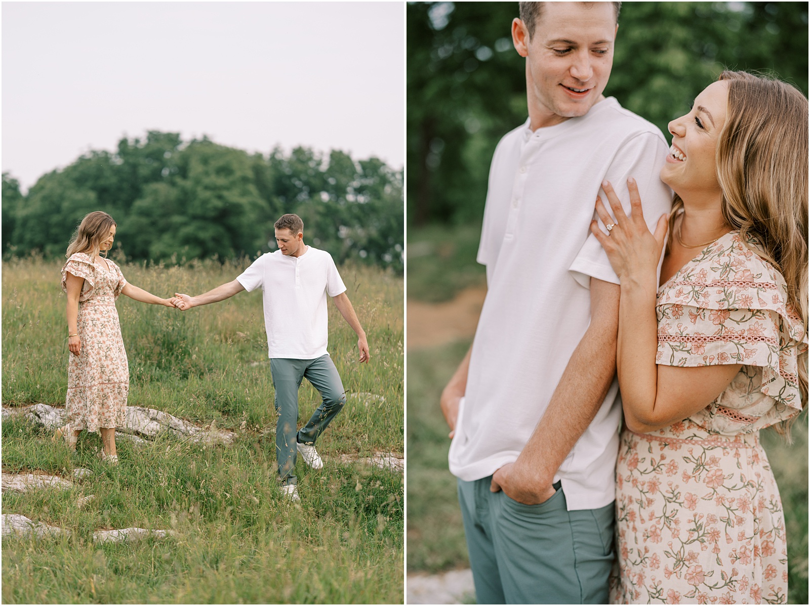 We photographed their engagement in her parents backyard. It was the perfect Greencastle field surrounded by warm light and tall grass. Oh, and cows! Of course! No elaborate props or fancy setups; just the two of them, wrapped in laughter and warmth, the same kind that started over burnt steaks and a golf lesson. 😉